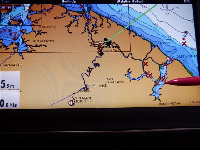 Within a few days the rally was assembled in Dewhurst bay (I’m pointing to it with the pencil) for the start of the convoy that we were being encouraged to join for our safety. The pirate situation in the Sula sea was perceived to be a big enough threat to concern the Malaysian navy, having already been told a curfew was in place from 6pm to 6am.