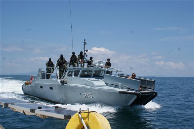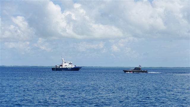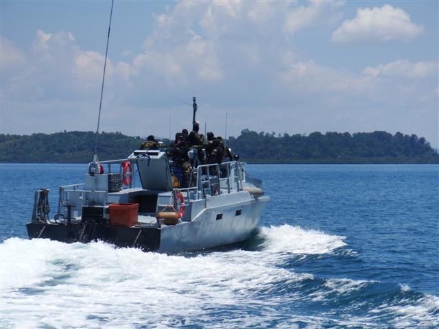 4th August started off a sad day for me because it had been a year since my Mum had passed away but I wasn’t allowed to be sad for long because on our passage to Lahad Datu the security was really stepped up as we approached the area where there had been a pirate attack earlier in the year. As well as our now normal police escort and the gunboat, first we were over flown by a police helicopter, then these guys pulled alongside us. Were they the pirates?