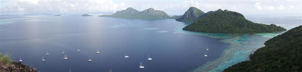 Wednesday 6th August we motored the 33 miles to the Tun Sakaran marine park and Pulau Bohey Dulang. The first sight of these islands took our breath away. The sheer cliffs and lush tropical jungle make a striking contrast to the fairly flat, palm tree covered islands around it. Being part of the rim of an ancient volcanic crater, now inundated, it’s encircled by coral reefs. Normally yachts aren’t allowed into the lagoon because it’s a marine research centre but the rally had obtained permission for us to enter. One by one we entered the reef at waypoint