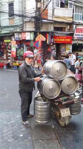 The maze of streets was interesting but for us it was spoilt by the amount of motorbikes everywhere. Up to the early 1990s motorised transport was reported to be rare with most people using bicycles to get around but now everyone seems to have a motorbike and the city now struggles with soaring pollution levels. Motorbikes are used to transport everything and everyone. It was common to see Mum, Dad and 2 or 3 children all riding together, many without helmets. This man was transporting barrels of beer on his.