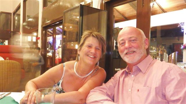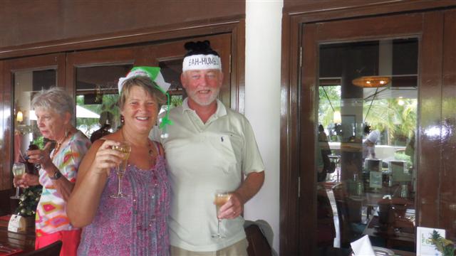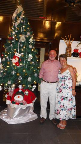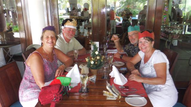 The Christmas lunch, at the equivalent of £20 a head, included unlimited sparkling wine, is this a good thing you may well ask? Bill and I sporting our Christmas hats brought from the UK with our first glass of bubbles. Norman and Sara joined us again. (My new bag is in the foreground).
