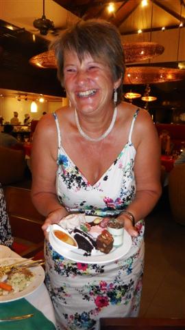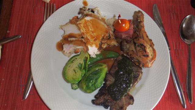 The meal started with a delicious pumpkin soup followed by an amazing array of starters and salads; again as part of an all you can eat buffet. (Should have joined us James) My Christmas dinner was roast turkey, a little sausage thing, a barbecued chicken leg, a really tasty piece of barbecued lamb and a Brussel sprout but NO roast potatoes! Can’t please some people can you? It was all beautifully cooked and tasted all the better for not having cooked it myself.