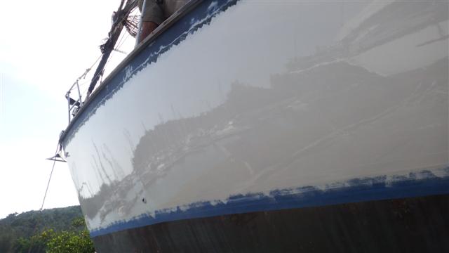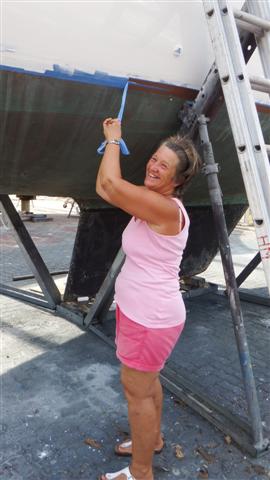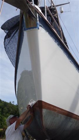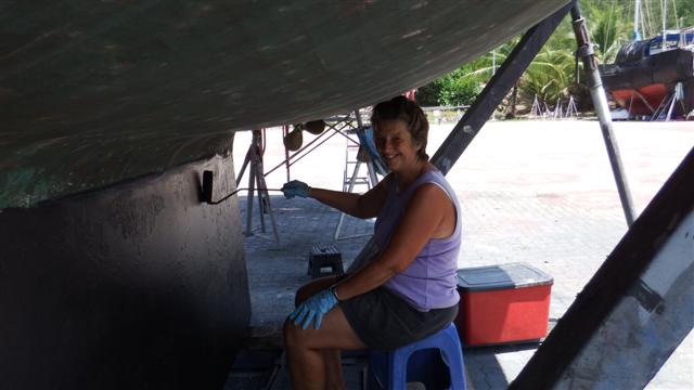 I gave Camomile a pedicure after we had scraped her toes on the coral last year (I anti-fouled the keel!) Nice shade of black. It had 4 coats in all during the day.
