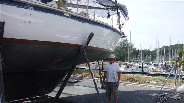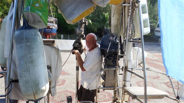 We got our mainsail from Phil Auger who is based in Kuah, Langkawi. Malaysian phone no 017 625 4902 Phil came to the boat to measure up and discuss our requirements at Christmas. Our new sail is Marblehead Dacron fully battened with UV proof thread. Phil is very knowledgeable about sails and forwards the requirements to a sail loft in Hong Kong where they are made. When it arrived after 5 weeks we gave Phil our old sail so he could remove the cars and sew them onto the new sail, as there wasn’t any thing wrong with them and new ones are expensive. The cost of the new sail worked out to about £2300, which included the battens.