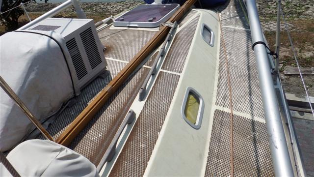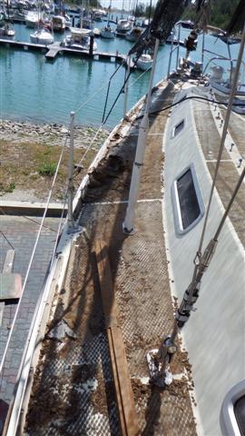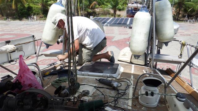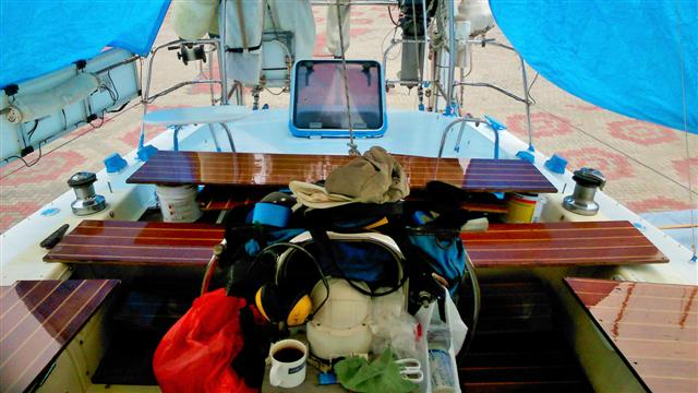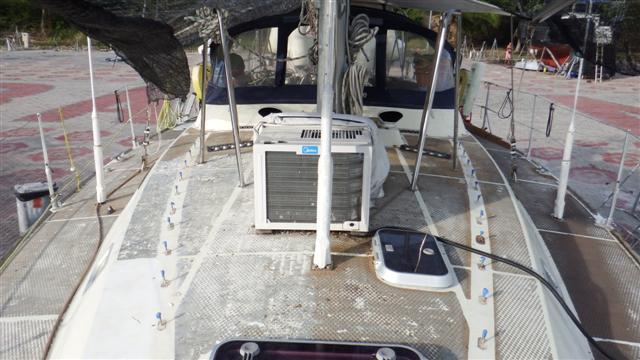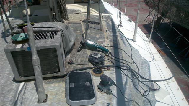 Tuesday 10th March Bill moved the air-conditioning unit to the cockpit so that it pumps through the entry hatch, he didn’t want to not have it on, it cools the inside of the boat to make it bearable to live here. After removing the last of the treadmaster from where the air con unit had been, he then removed all the deckfitting that were going to be in the way and did the first fill of the major dings and redundant holes.