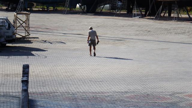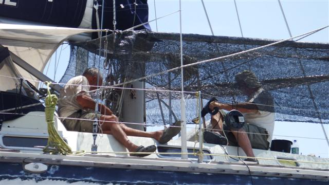In the afternoon Bill started stripping the aft deck, removing the grab handles and covering them with more nuts and blue tape. The dorade vents were also removed and I moved the lines and the aft fuel cans. When it was all cleared I vacuumed the whole deck to clear all the dust from the deck ready for Bill to paint the final topcoat in the morning. There must be no chance of anything ruining it. There was time for a swim at the end of the afternoon and a meal with Norman and Sara.