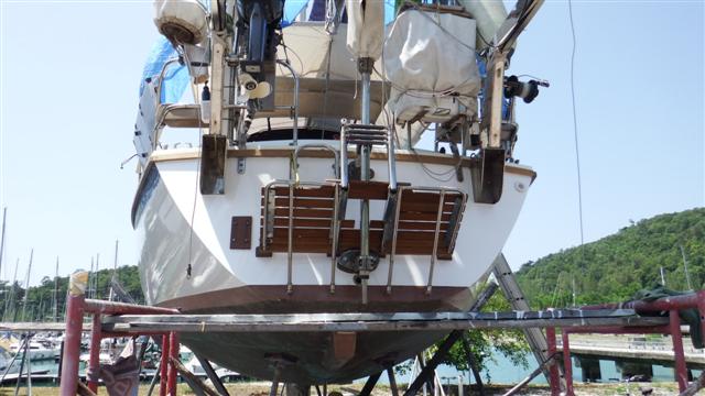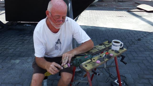 In the afternoon Bill continued with the transom by refitting the serviced Hydrovane and Norman started sanding with the big grinder but he still wants to be sacked!