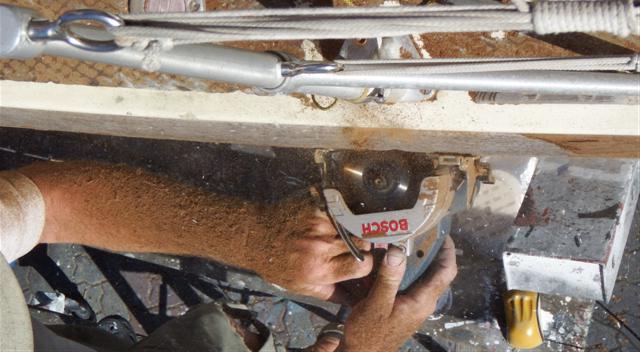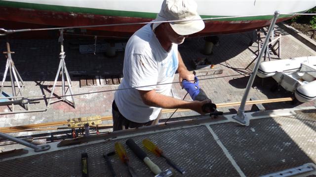 Saturday 28th February Bill continued to remove the toe rails. The problem Bill had was that the toe rails could not be removed by removing their screws because they are glassed in underneath the deck and to remove them would turn into an extremely messy and lengthy job. His plan was to remove the screw heads with a special tool he bought in Australia. It works with a pump action sawing movement and within a minute the screw head pings off.