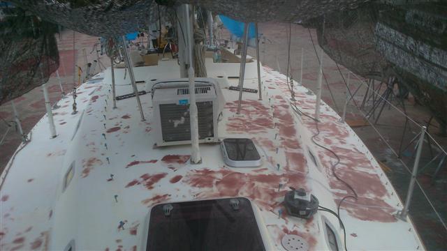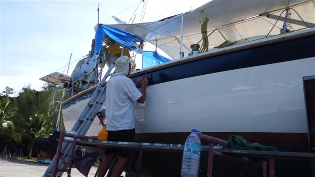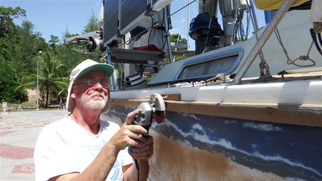 As a result of the successful first topcoat we’ve taken the decision to stay at Rebak and Bill will now paint the topsides too. This is a huge undertaking but as you can see in the photo the coach roof is as bad as the hull and having now started it makes sense to continue. You can also see how worn the Treadmaster has become. The problem we have is our friend Norman, who’s just arrived, has a couple of days spare to help Bill with the removal of the Treadmaster and if we moved the boat there’s a limit to how much of the deck gear could be removed. We couldn’t undertake a 2 day passage with holes in the deck and if we didn’t remove the deck gear Norman wouldn’t be able to help with the removal of the Treadmaster; so you see our dilemma.