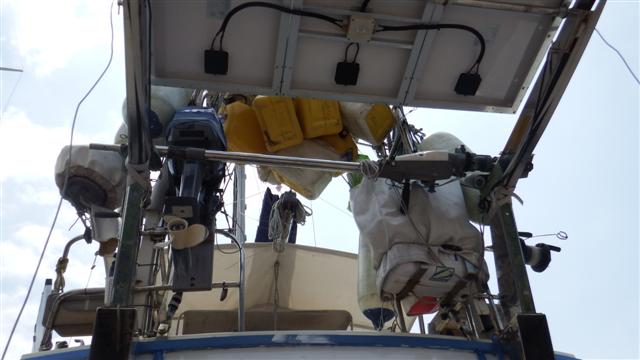 To help with the task, as we weren’t moving now, I was able to remove all the lines off of the deck. The fuel cans needed to be moved too so I tied those to the A-frame, which is looking rather overloaded. Bill also removed the grab handles, which he’s replacing, but this left bolts sticking up from the deck. Bill carefully attached a nut to the top of each one with a bit of blue masking tape around them so that if anyone sits or stands on them hopefully they won’t do to much damage to themselves.