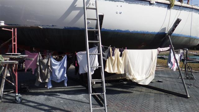 The dinghy cover is almost finished. To attach it to the dinghy I’m going to use Velcro but first the ‘sticking’ side of the Velcro has to be sewn onto strips of Neoprene, which in due course will need to be glued onto the dinghy. So I spent the rest of the afternoon sewing the strips of Velcro to the neoprene. On Camomile I am lucky enough to have a fridge and a freezer. The freezer is a Waco unit and continues to work as normal while we are out of the water. The fridge is a new water-cooled unit that Bill fitted in NZ and unfortunately was protesting about being out of the water without any water to cool it. I have turned it down to stop the unit overheating but it’s protesting too much so I’ve decided to turn it off. In this heat that’s a huge problem but I’ve turned the freezer up so it’s not freezing and have moved some foods in there. It just means I’ll have to shop more often. Wash day again.
