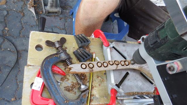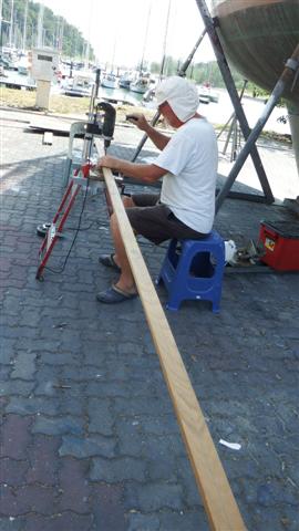Next job was to prepare the cladding for the rubbing strake along the side of the deck. If you remember again Bill can’t remove it because the bolts are glassed in on the inside of the boat so first he prepares the wood strip by drilling the holes ready to apply.