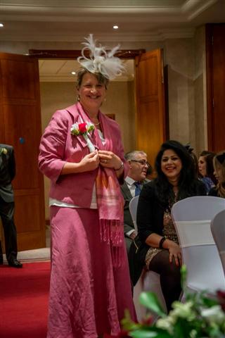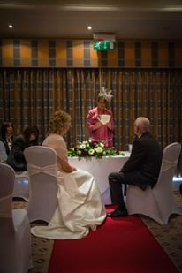 Sunday 29th March was the day of the wedding. It took place at the Apollo hotel at the end of her road. Unfortunately we woke up to rain but the ceremony and the reception were all inside so it didn’t matter. We took our clothes down to the hotel in the morning and Angie’s hairdresser came to do our hair and the little flower girls. There was Lucie, one of Angie’s grand daughters and Jessica, one of Terry’s grand daughters, very diplomatic. The lady from the wedding shop came to help her get dressed and wove Mum’s wedding ring into the back of her dress.