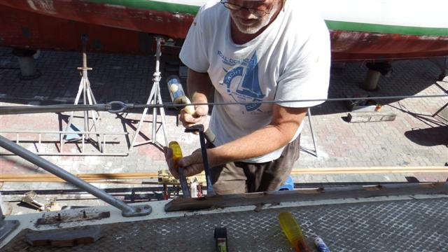 At the end of the afternoon Bill removed the lugs for the yachtlegs that will be in the way when we have to apply the stripe. They put up a bit of resistance so using his club hammer made him feel better. They are chunky old things but then they need to be to hold the boat upright when the yachtlegs are in them.
