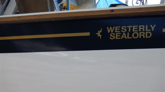 Doesn’t she look beautiful? (This section doesn’t have the cladding on the rubbing strake yet.) When Bill was rubbing down the old stripe he found the original position of the Westerly name under the surface so he’s put it back where it should be.