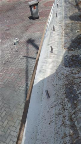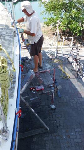 This is what the deck looks like with all the studs sticking up. He removed the grab handles in the same way. Meanwhile I was busy sewing the Velcro on the dinghy cover and fitting it onto the Velcro strip on the dinghy. It all fitted very well but I failed to take any photos. I took it off again because I don’t want it covered in dust while I’m away.
