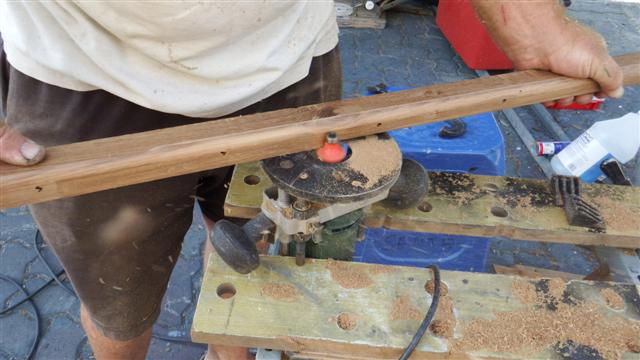 Tuesday 3rd March Bill started making new toe rails by clamping his router to his work bench and passing the wood over it’s cutter to get the shape he wanted, using the old toe rails as guides.