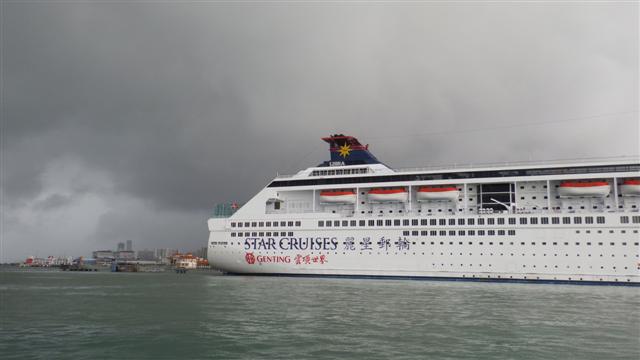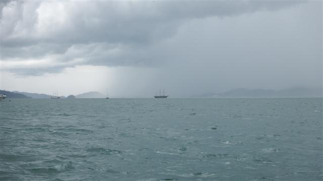 Friday 12th we left Straitsquay on the high tide. We had had our 3 nights and needed to get going again. Tricky, Jane and little Millie on Ananda had left the day before and Bill and Caroline on Juffa, who were anchored outside the marina, were leaving at the same time as us. As we motored past this cruise liner in the cruise terminal the clouds were bubbling up behind it. Within an hour they were overhead and lashing us with rain. The visibility was down to less than 100 meters. Following Juffa towards the Panang bridge they called on the vhf to warn us there were fishing lines in the water. They were trying to weave in between them and we followed. I could see the floats in front of us but the two ends disappeared off into the distance. Bill took the decision to go over them. So with bated breath and the engine out of gear we floated over them. Luckily they didn’t follow us so we obviously hadn’t hooked it.