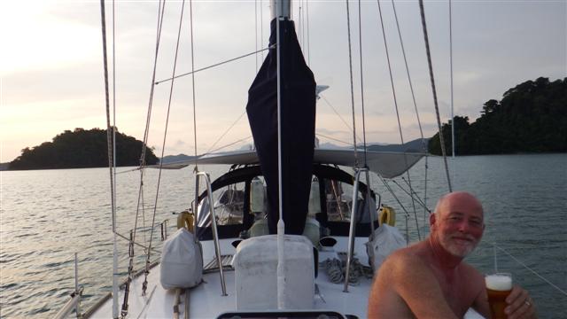 Bill spent all of the morning of the 5th June trying to replace the davit wire. It proved to be quite difficult but he managed it in the end. The anchor came up just after 1pm and finally it was goodbye to Kuah until the end of the year. We didn’t go far and anchored at Pulau Besar just 2 hours away. Sundowners on the deck again.