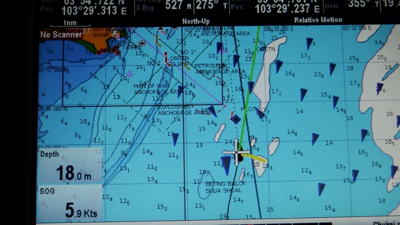 We went back to the boat for another round of shopping, sewing and preparing for our summer on the East coast of Malaysia before finally leaving at 06.30 on 5th July with Inspiration Lady following. First we had to sail or motor around Singapore on the edge of one of the busiest shipping lanes in the world. There were many cargo ships carrying containers but this one was loaded with blades for wind turbines. From the writing on the bow we assumed it had come from China but no idea where it was heading.
