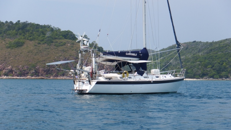 Left the beautiful anchorage on Friday 10th to motor the 15 miles to Tioman island. Fortunately there were 2 spaces in the marina so Camomile and Inspiration Lady went in. Juffa was already there. Jackie and I hit ‘the shops’ in the afternoon while Bill tried to organise some power so we could have the air conditioning on for a few days. Tioman is a quaint island and like stepping back in time but Jackie and I managed to find a few supplies to booster our larder. It’s also duty free which meant cheap wine – yessss. Mick and Janice anchored Zoa off one evening and we joined them and Inspiration Lady for a meal ashore.