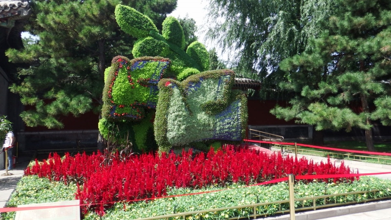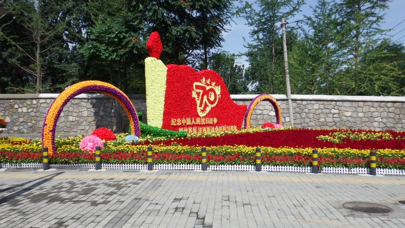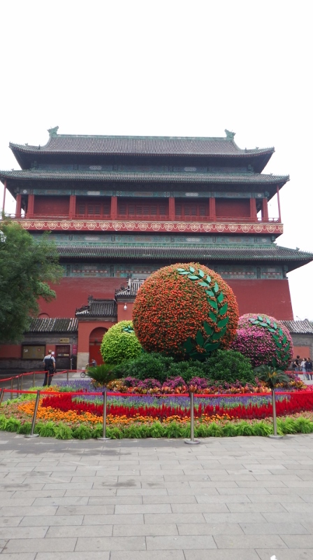 The walk leads into the Drum and Bell tower square. Sadly the two towers were closed although we couldn’t find out why. We assumed it was because the guards that normally look after these places were needed in Tiananmen square for crowd control. So we didn’t get to see inside but there was a beautiful flower display outside the drum tower.