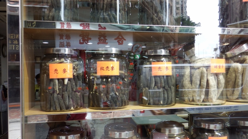 Our walking tour led us through a journey into Hong Kong’s past as we passed dried seafood shops and herbal medicine wholesalers. They had some fairly dodgy looking things in their windows. Despite what these look like we think these were dried sea cucumbers.