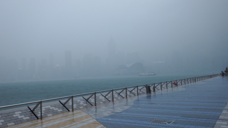 The rain had eased briefly and we started walking along the Tsim Sha Tsui promenade which gave spectacular views back across Victoria harbour to Hong Kong island but the storm clouds were building. We managed to get to shelter before this view….