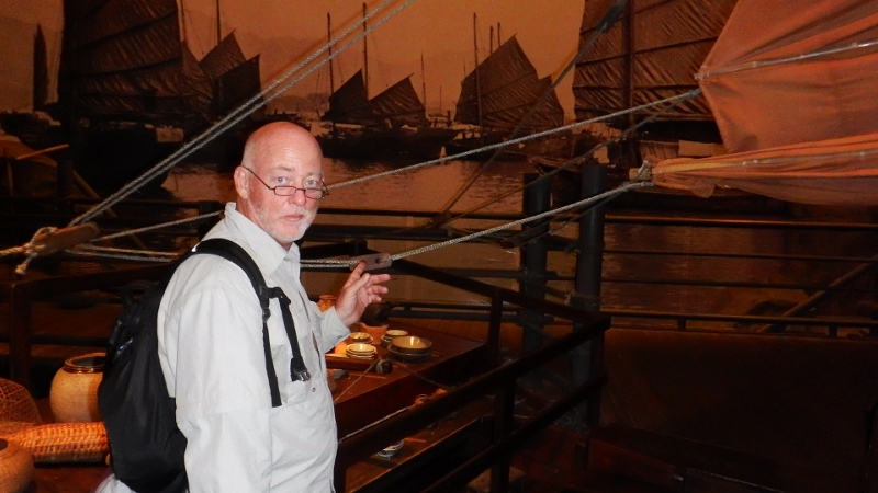 We sheltered for about 15 minutes then decided to abandon the walk and head for the Hong Kong Museum of History. Fortunately Hong Kong is used to the rain and it’s possible to walk large swathes of the town either underground via the underground train system or over a series of covered walkways and we managed to get to the museum only a little damp. The museum takes you on a fascinating journey through Hong Kong’s past from prehistoric times to 1997. As luck would have it museums are free on Wednesdays – lucky us. We spent several hours looking at the exhibits, it was very well done except for this life size model of a junk rig which, as Bill had to point out, didn’t have it’s mainsheet attached properly – what a geek!