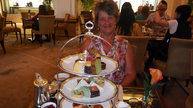 There was a gallery for the musicians to sit in as they played nice ‘soft’ music. We chose Peninsular afternoon tea with a selection of sandwiches and cakes. The three tier cake stand arrived with two of everything and four warm and freshly baked scones on the bottom tier with jam and clotted cream. We took it in turns to decide which ones we ate, some of the cakes were very rich; we didn’t leave any for Mr Manners. We really enjoyed it and everything was delicious but decided it didn’t beat our tea party in Raffles last year for my birthday.