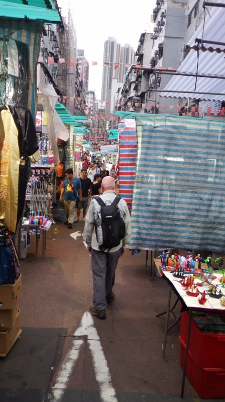 The walk took about an hour then we got back on the MTR (underground) and took the train to Wan Chai area and had lunch in an English pub called the Queen Victoria in the red light district although all the girlie bars were closed.. It seems like an odd choice but we both choose PORK sausage with mash. We just don’t get pork sausages in Malaysia. It was delicious. After lunch we wandered around the street markets which was really interesting. These two men were playing some sort of board game which looks like a cross between chess and draughts. There was a lot of shouting involved.