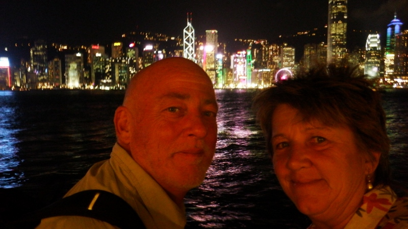 Back at the water front the clouds had lifted and it was now possible to see the tops of the sky scrappers and Victoria peak behind them. It was an amazing sight. As it got darker each building had a set of LED lights creating it’s own little light show and altogether forming a spectacular display. The tall building left of centre with the diamond patterns is the Bank of China headquarters, the smaller building to the right with the red lights is the HSBC building and the circle is a big wheel. We waited until 8pm for the laser show which was also really clever. Returning on the Star ferry we sat on the upper deck on the way back.