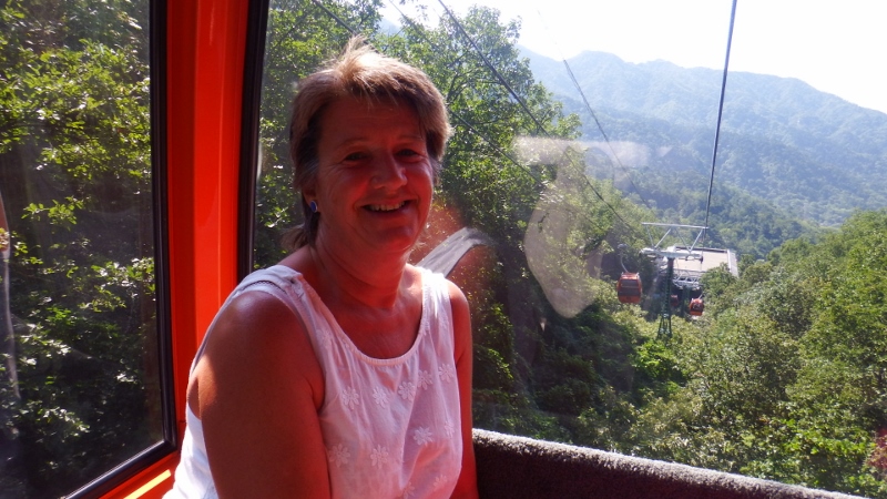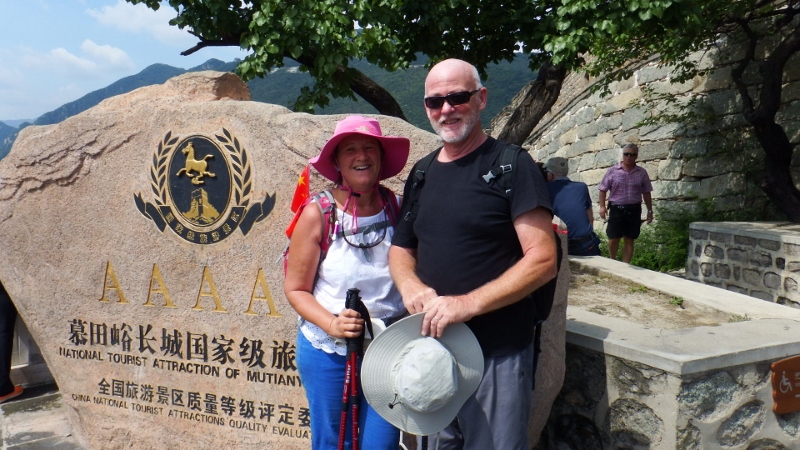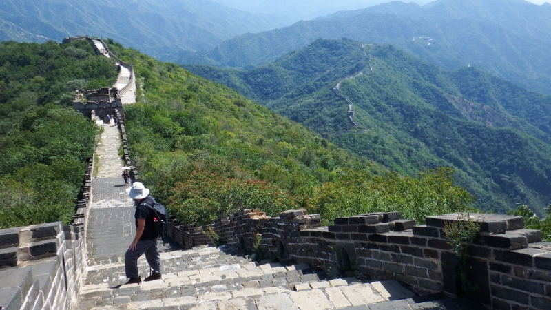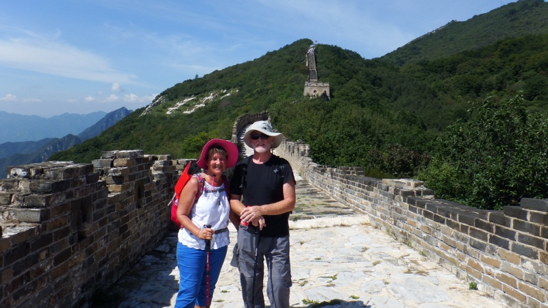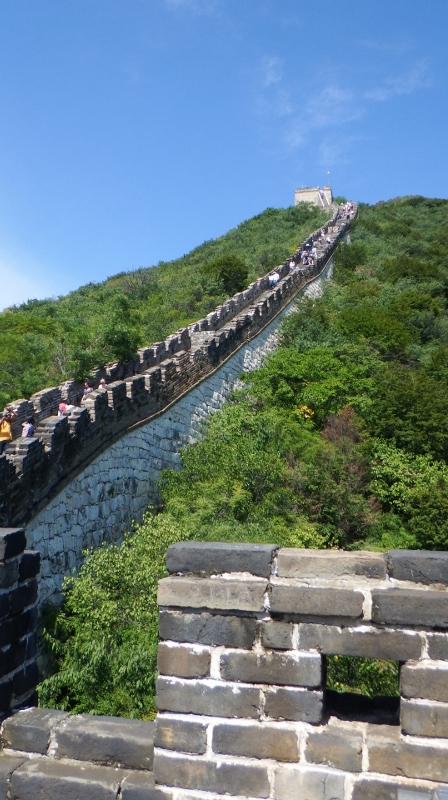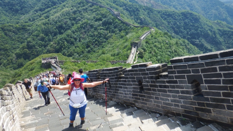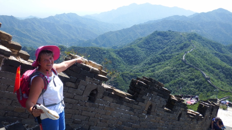 I have wanted to walk the Great Wall of China for a long time and today, the 7th September, we were going to do it. The day was perfect with blue sky and sunshine. We had decided to go with the hotel tour because although you can get there on public transport there was only 2 days left in Beijing and I didn’t want to miss it. The coach journey took about an hour and a half so we were ready to stretch our legs when we arrived. The Great wall was created after the unification of China under Qin Shi Hangdi over two thousand years ago. It snakes through the countryside for several thousand miles and enabled speedy communications as well as the rapid transport of troops throughout the country. There are 4 main areas to visit the Great Wall from Beijing. Badaling is the most touristy part of the wall followed by Mutianyu which is less commercial. There are also 2 areas that are only partly renovated and apparently a bit of a struggle. We decided to go to Mutianyu in the hope there wouldn’t be too many people there.