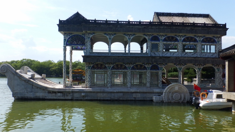 In front of the boathouses was this magnificent marble ‘boat’. The Empress Dowager Cixi, a right little madam by all accounts, paid for this extravagant folly with funds meant for the modernisation of the Imperial navy at the end of the eighteenth century but she squandered the money and this was the only vaguely nautical thing that she spent it on.