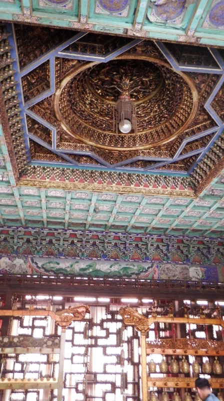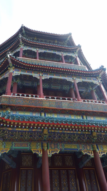We moved onto the Garden of Virtue and Harmony which was a three-story building that had served as a theatre where the court’s 348 member opera troupe entertained the emperor who watched from a gallery opposite. The restoration of the decoration around the eaves was superb.
