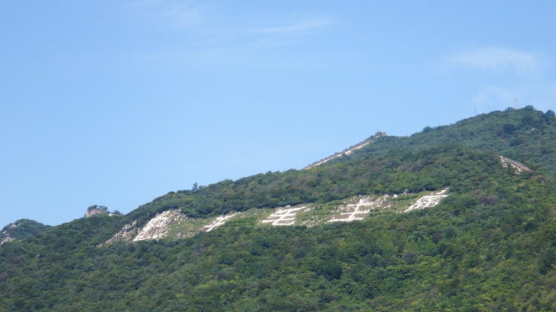 I felt so emotional when I got to the top and saw the Great Wall for the first time I burst into tears. Memories of my childhood walking the Seven sisters near Eastbourne with my Dad and my Uncle Terry as a little girl came flooding back. How Dad would have loved this, maybe he was walking with me. I took this photo from the terrace of the cable car platform. You can see the wall winding ahead with the very steep steps half way along. This is a close up of the Chinese lettering on the hillside.