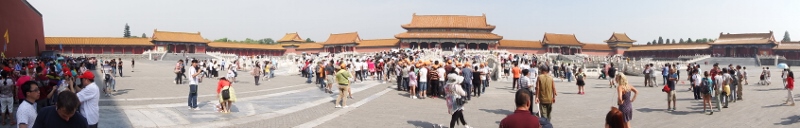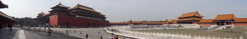 The Forbidden city, officially known as the Palace museum, is China’s most magnificent architectural complex and was completed in 1420. It has seen s4 emperors rule during it’s 500 year history. It was the exclusive domain of the imperial court and dignitaries until the 1920s. In front of us was the Meridian gate, a U-shaped portal at the south end of the complex. In former times the emperor would review his armies and perform ceremonies from the balcony marking the start of the new calendar. He would also pass judgement of prisoners and oversaw the flogging of troublesome ministers! I took a panoramic shot of it because it’s difficult getting some of these buildings in one photo.