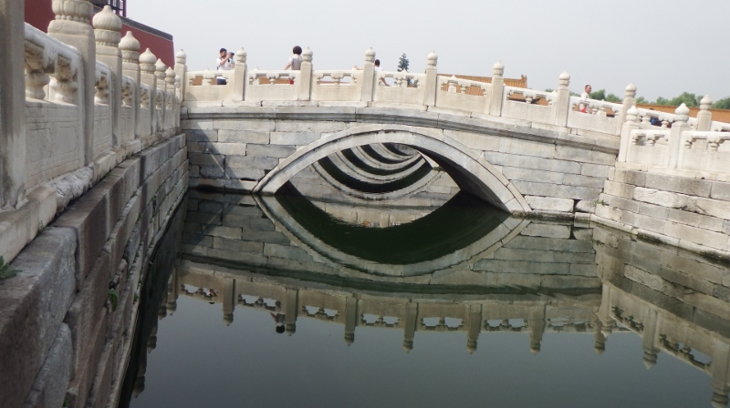 Once back in the main courtyard we made our way back to the entrance with the five marble bridges symbolising the five cardinal virtues of Confucianism. They cross the golden water which flows from west to east in a course designed to resemble the jade belt worn by officials. We crossed over them.