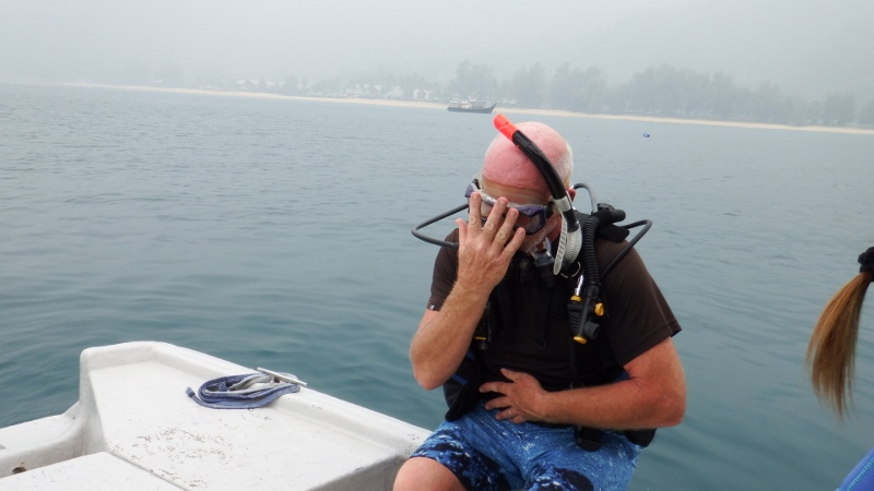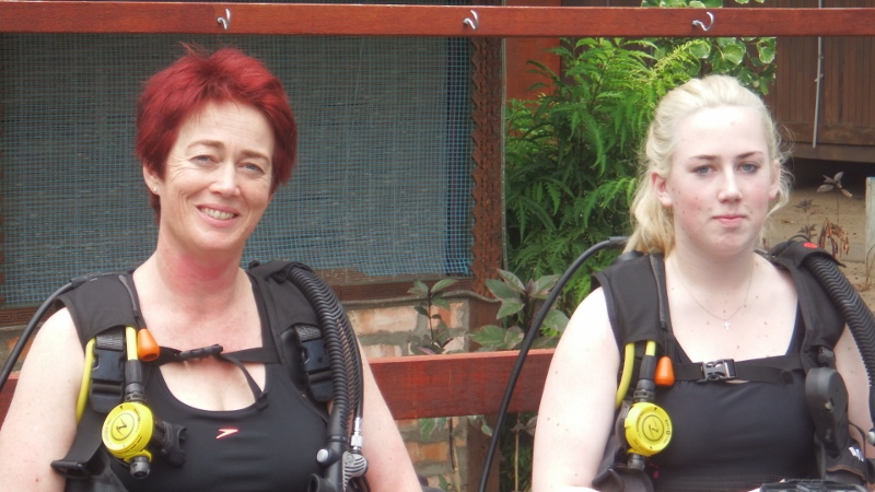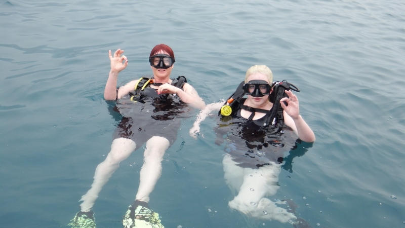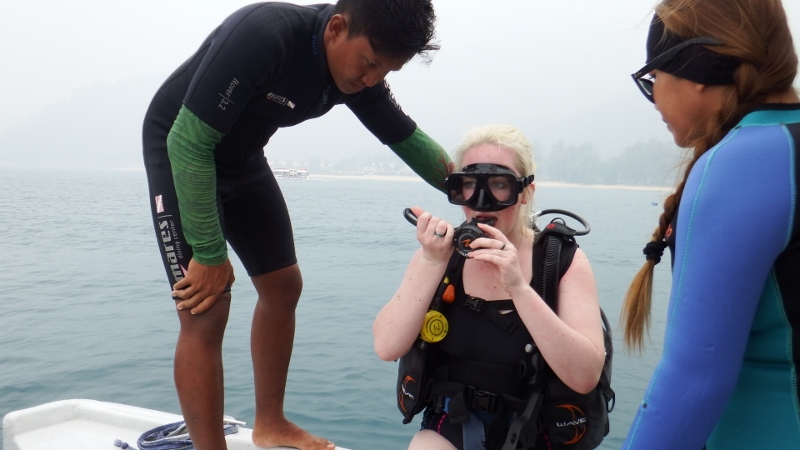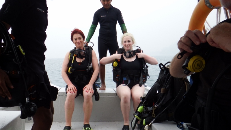 The first day of their mini holiday with us was spent diving. Kate has a Padi certificate but was a bit rusty and Daisy wanted to do a try dive. There was a dive school just along the beach from the marina that didn’t have any customers on that Monday and were happy to take us all out. First Kate and Daisy had a little skills test in the water in front of the dive school. Yn pronounced yen was very pleased with them. It was great to get his undivided attention