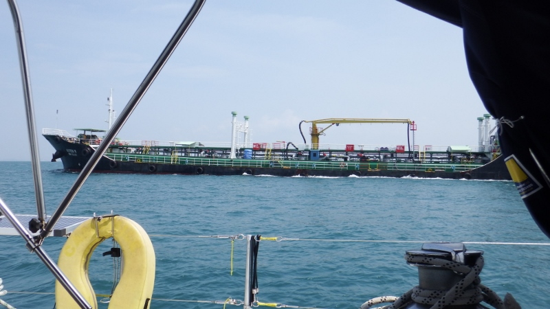 The next morning Bill and Gary paid a visit to the fuel barge in the dinghies to pick up some diesel in jerry cans. At MYR1.85 a litre (about 30p) it was a bargain. We noticed that the smog had lifted and the visibility wasn’t bad so decided to make our passage around the bottom of Singapore. Even though we kept out of the shipping lanes the ships coming in and out of Singapore came very close.