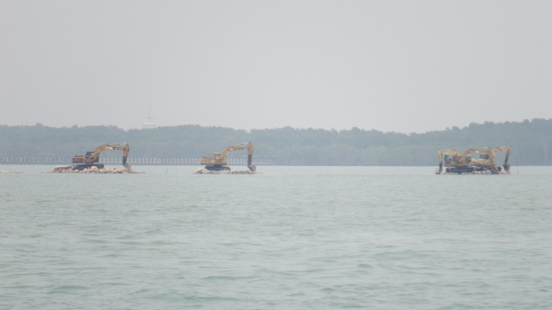 The next morning we rounded the south east tip of Malaysia for the last time and headed north. We worked out we’ve made the journey up and down the Malacca Straits 5 times in the last 2 years but this will be our last. From this point on we are on our way home – although it will still take us a few years. There’s a land reclaimation project happening down here but at high tide the diggers sit on little plots of land and looked very funny with the water surrounding them.