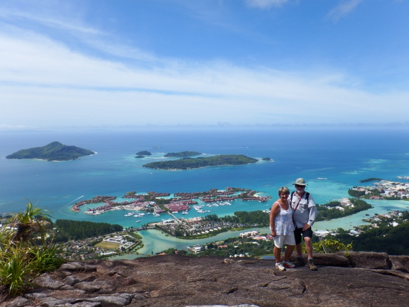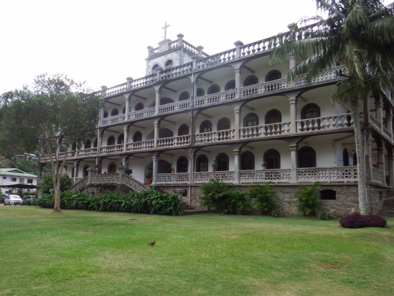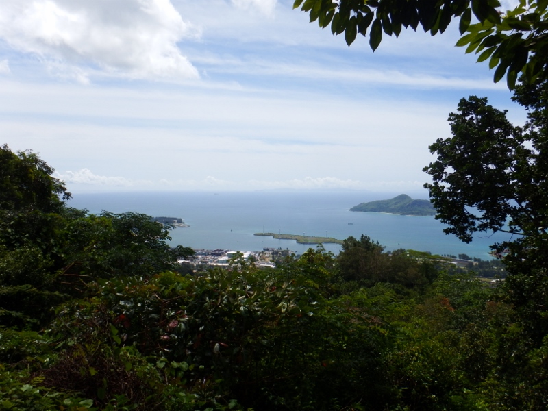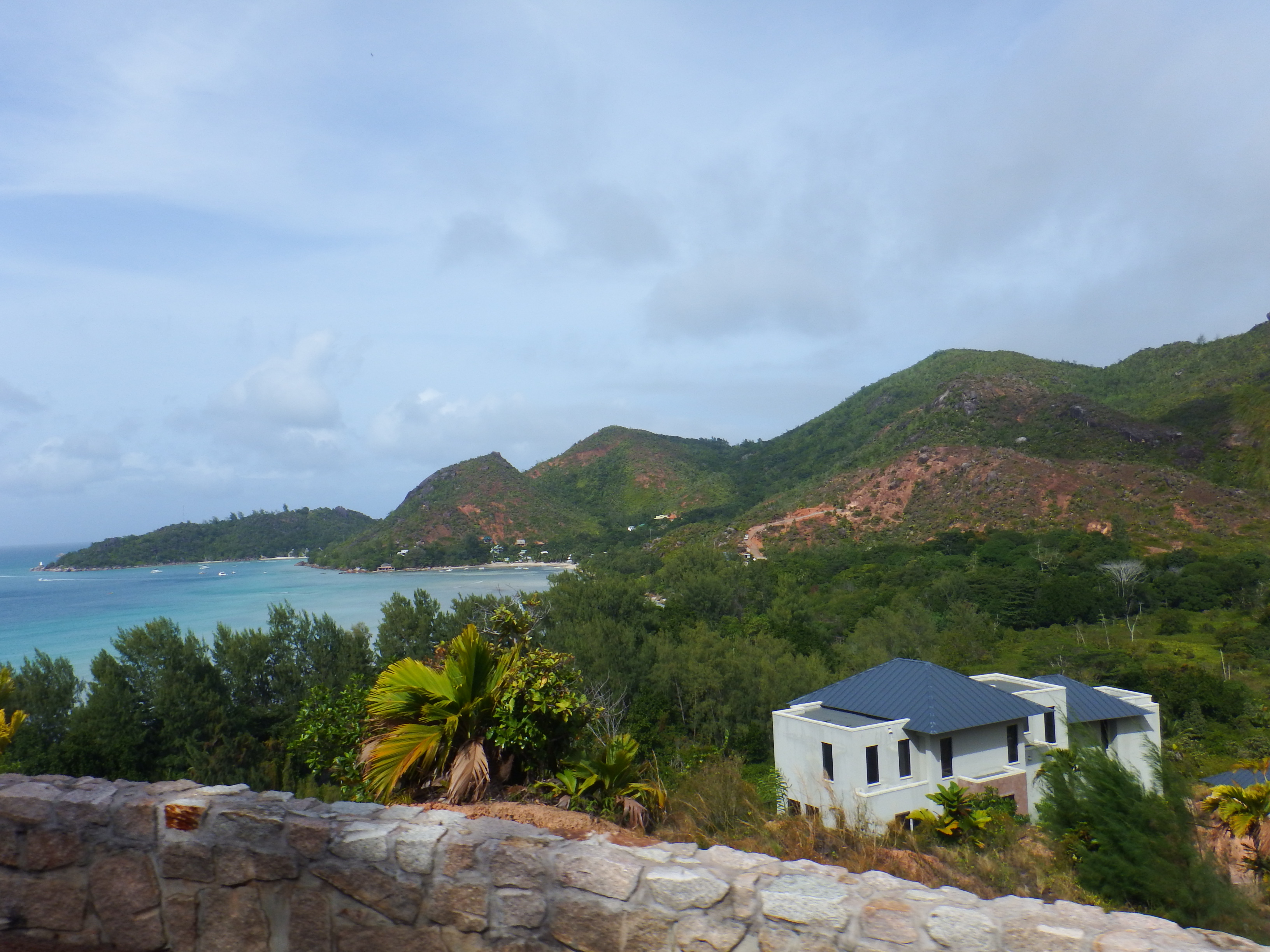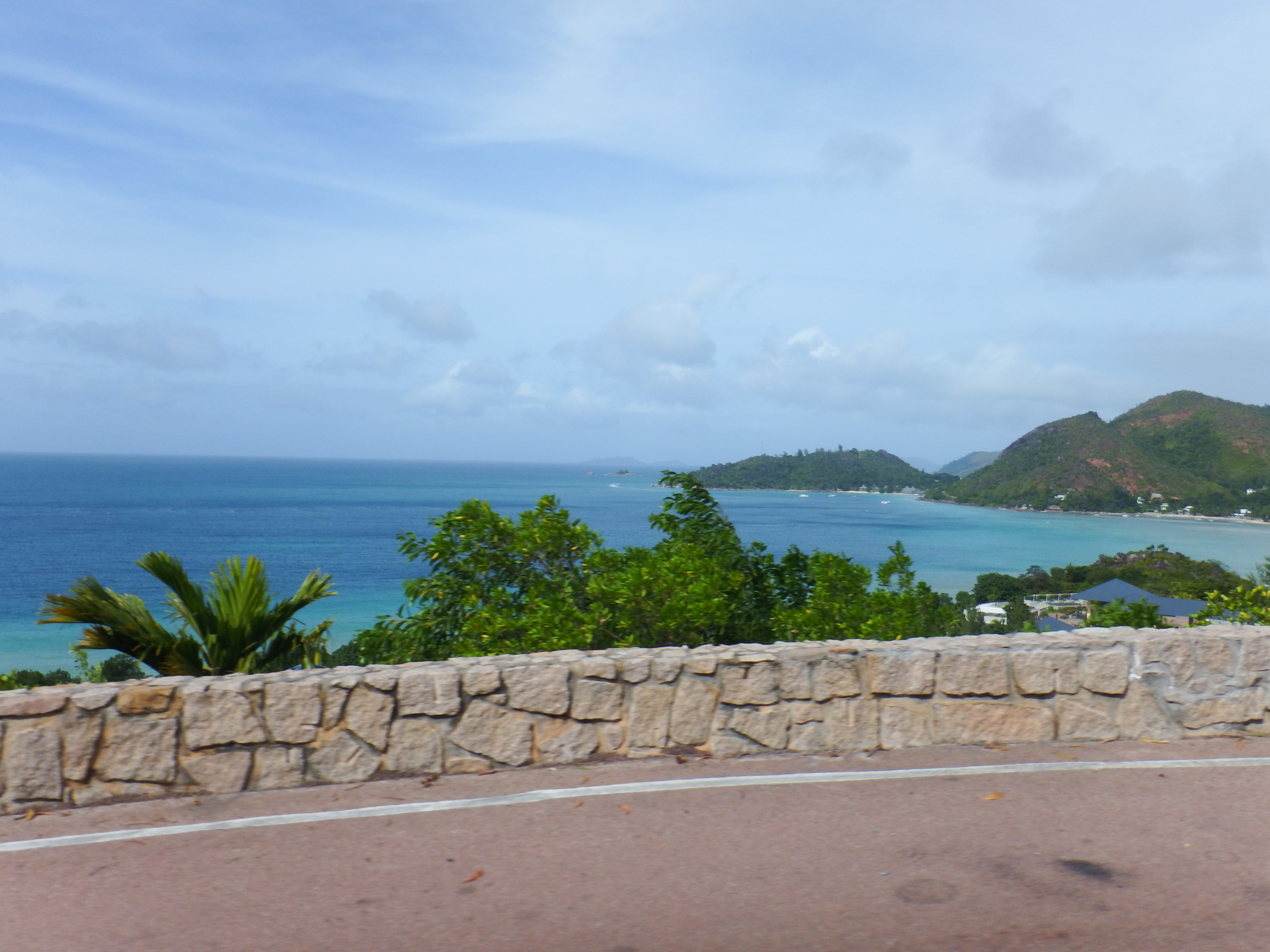 On Thursday we had another tourist day with Tintin and got on a bus. Public transport is very reasonable here. It costs 5 rupees (about 30p) a ride whether you go one stop or all around the island. We headed out of town on the Bel Air road passing the oldest cemetery in the Seychelles. Here lie some of the pioneers of the settlement of Seychelles. Leading onto the Sans Souci road it twists and turns upward. We got off by the Mission historical ruins to visit the viewpoint erected for the state visit of Queen Elizabeth II in 1972 on her tour of the Commonwealth Nations. Often there are misty clouds shrouding the mountain tops but today we were lucky and had a good view out across the islands, although the trees have grown a bit in 44 years.
