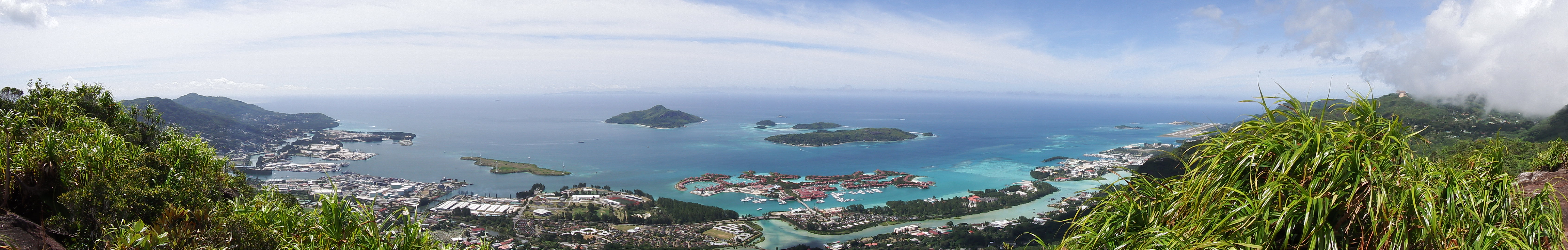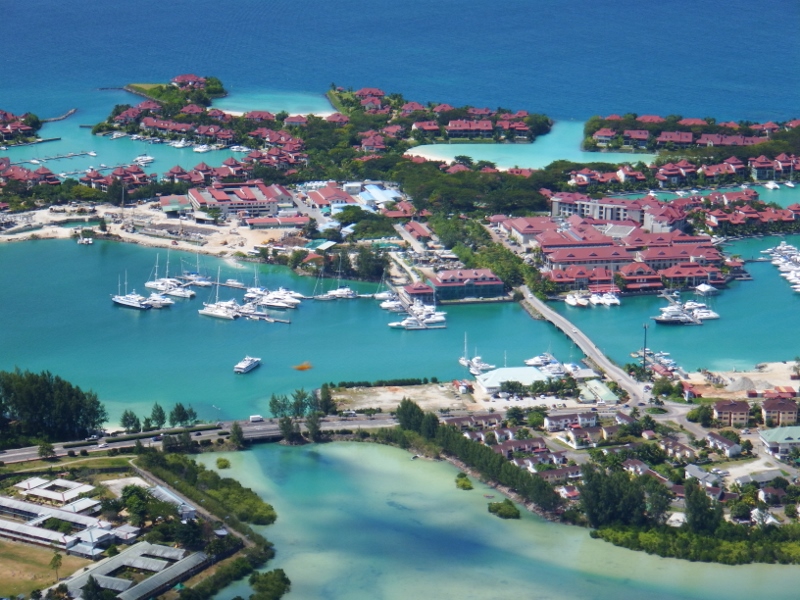 In this panoramic shot the airport is off to the south (right of the photo) and the islands of the St Anne national marine park beyond the marina.