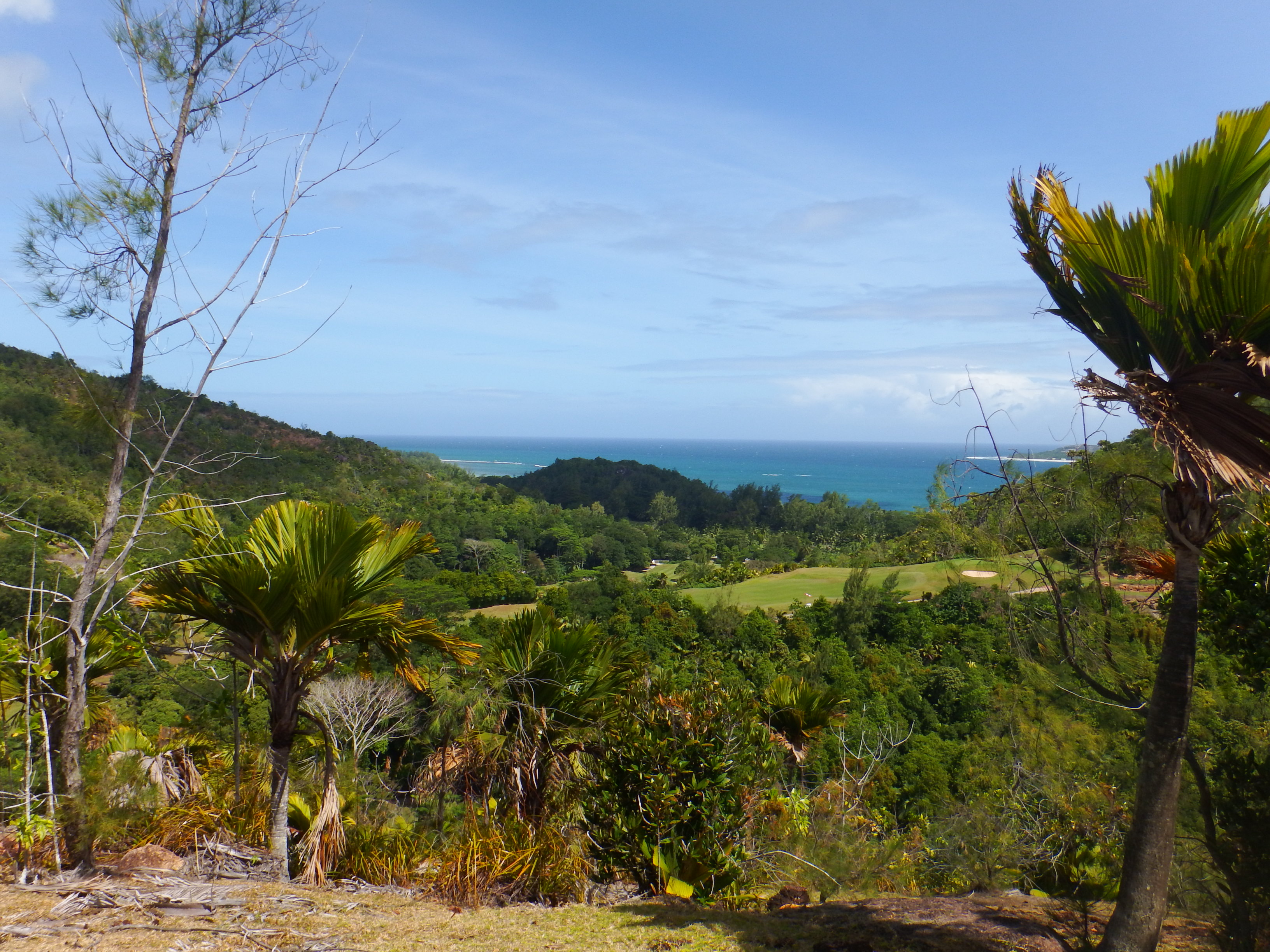 Once you reach the bottom of the hill turn right towards the big posh Lemuria resort. There’s a security guard on the gate but it he was allowing people through because it’s the only way to Georgette beach. The resort has the only 18 hole golf course in the Seychelles and very nice grounds. Stick to the path and after about 200 metres you’ll see a sign to anse Georgette on the right hand side. The path leads up past one of the fairways. Looking back down the fairway the path was along the other side of the lake. We’d been walking for an hour or so by now.