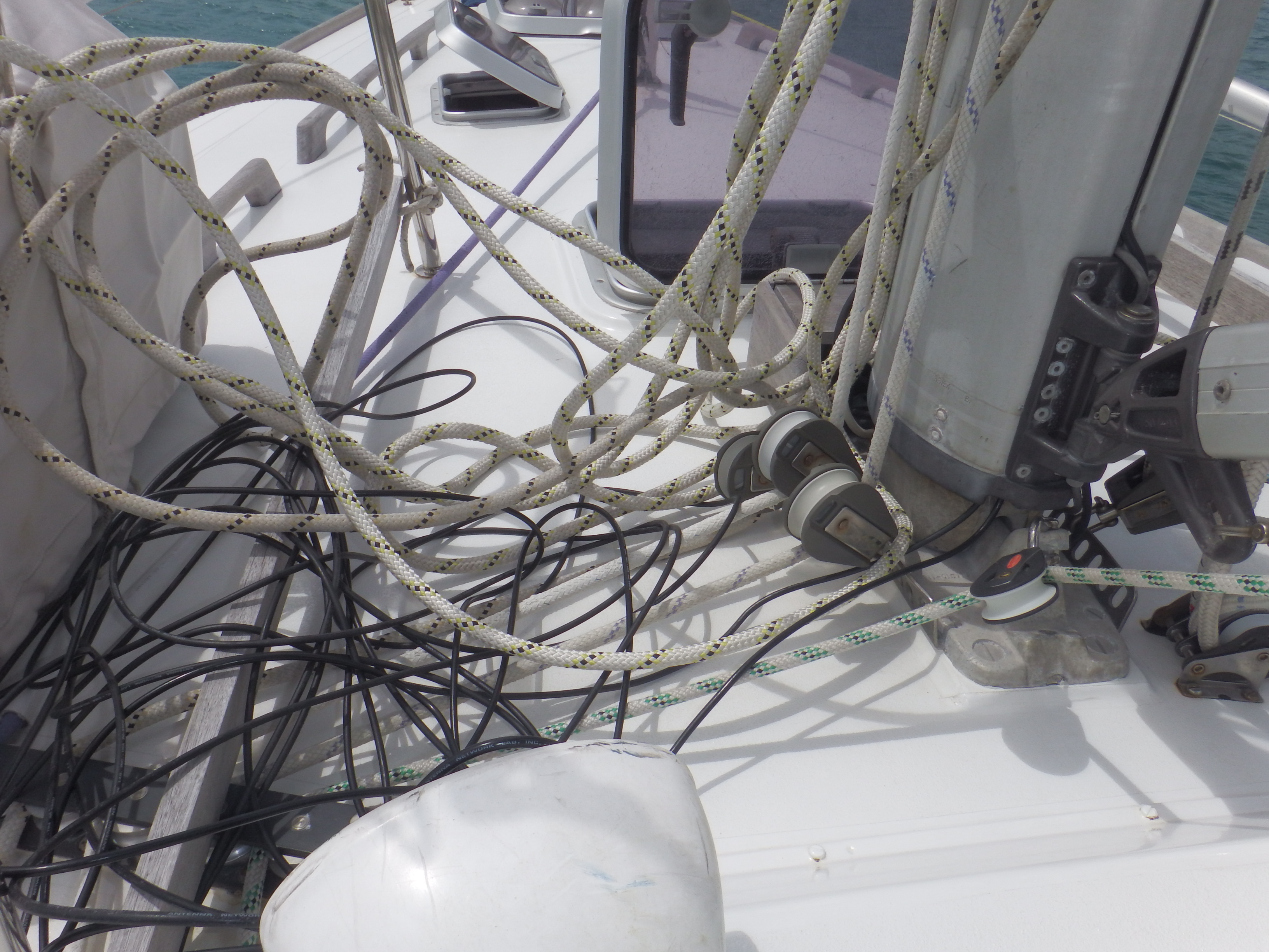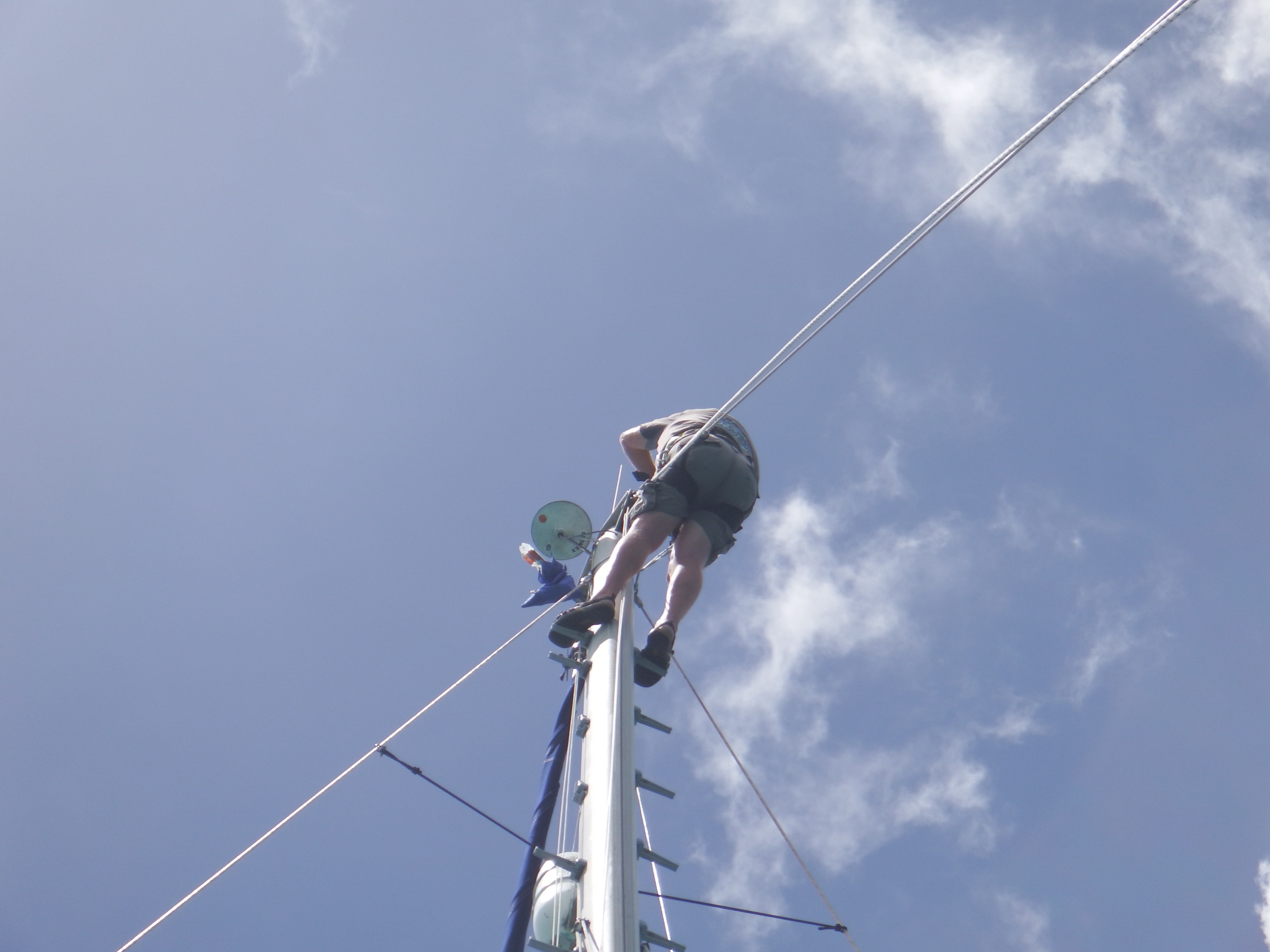 On Tuesday, having had 2 walks in 2 days, we decided to stay on the boat and do some jobs. Bill had bought a new aerial and cable in the UK for the VHF. This is the second aerial and cable in 2 years but tests had indicated that the reason the VHF wasn’t working was the aerial. The old aerial had been changed in Victoria and Bill discovered it had been leaking and had some corrosion on the inside, he hoped that had been the problem. While performing a radio check with a couple of other boats they reported our radio was still crackly so Bill wanted to go ahead and change the cable too as the top foot or two had also suffered from corrosion. That entailed him sitting at the top of the mast, joining the new cable to the old and pushing it into the mast while I was at the bottom pulling it through. Sounds easy? Nothing is ever easy on a boat; after an hour an a half it eventually came though. Poor Bill’s legs had gone to sleep.
