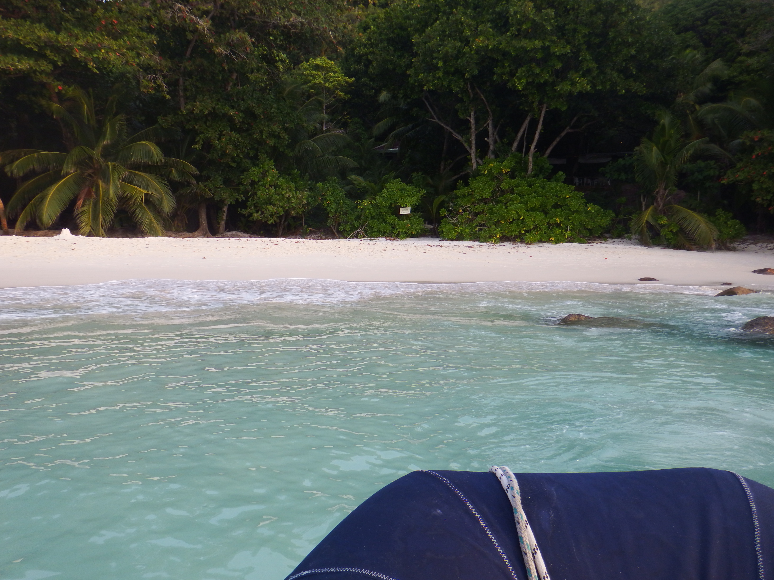 Our first night at anchor was quite refreshing, it was still hot because we are only 4 degrees from equator but with a light wind blowing over the anchorage it kept the boat a little cooler. The anchorage is on the north west side of the island and the wind comes from the south east at the moment so it’s quite calm there although you have to be careful when landing the dinghy because there’s a bit of swell and it’s enough to give you a wet landing. One of our sources of amusement is watching the charter yachts trying to land their dinghies!