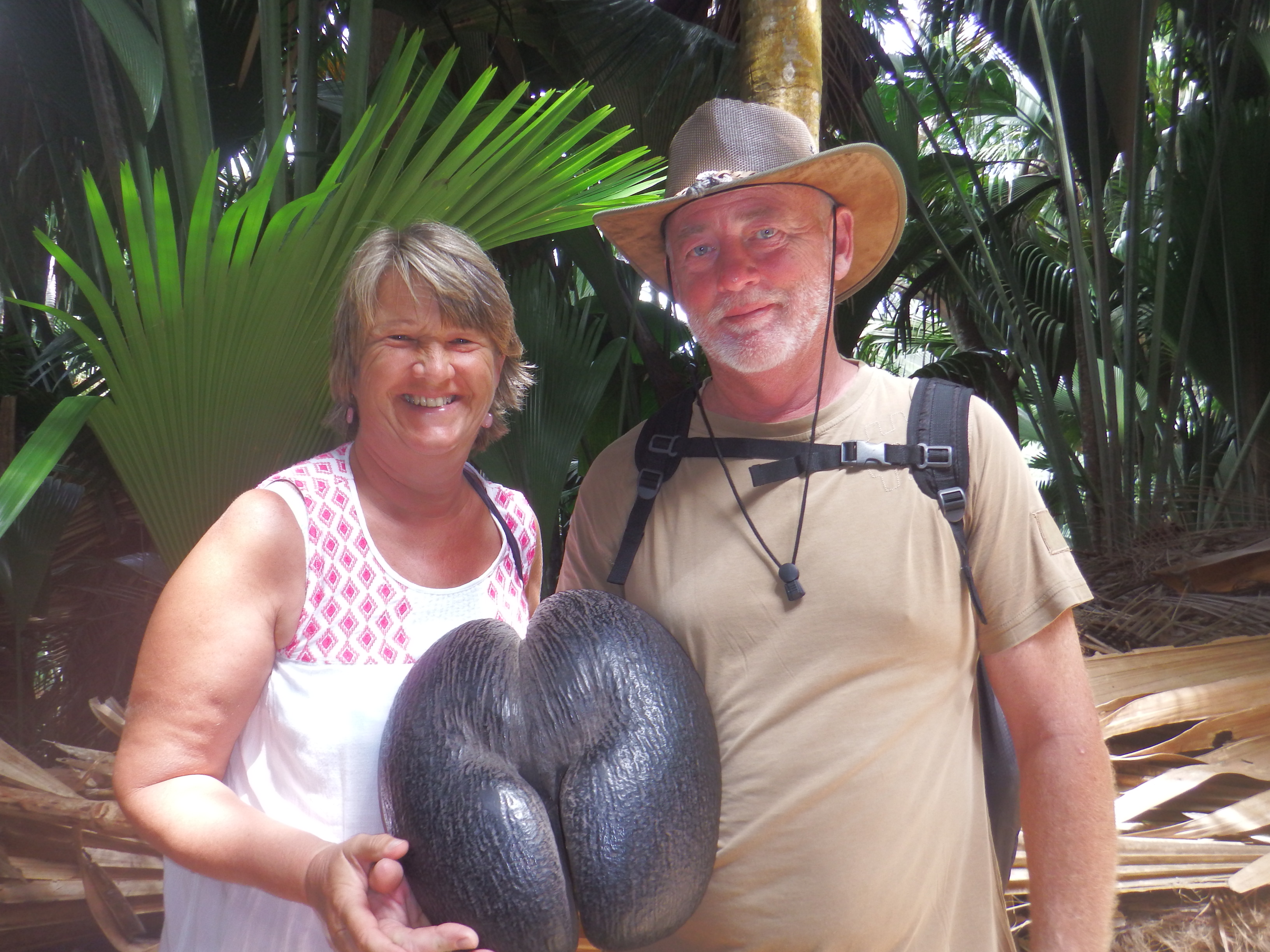 On our last day on Praslin we visited the Vallee de Mai which is home to the worlds largest forest of the iconic Coco de Mer palm. The British general Charles Gordon visited the valley in 1881 and decided that the valley was the Garden of Eden and the coco de mer the Tree of Knowledge. The female Coco de Mer trees bear the world’s largest nut that has the uncanny resemblance to the female pelvis. We were given one of these to handle on the way in but not to take home, they sell for US$200 +/- and are all numbered and certified.