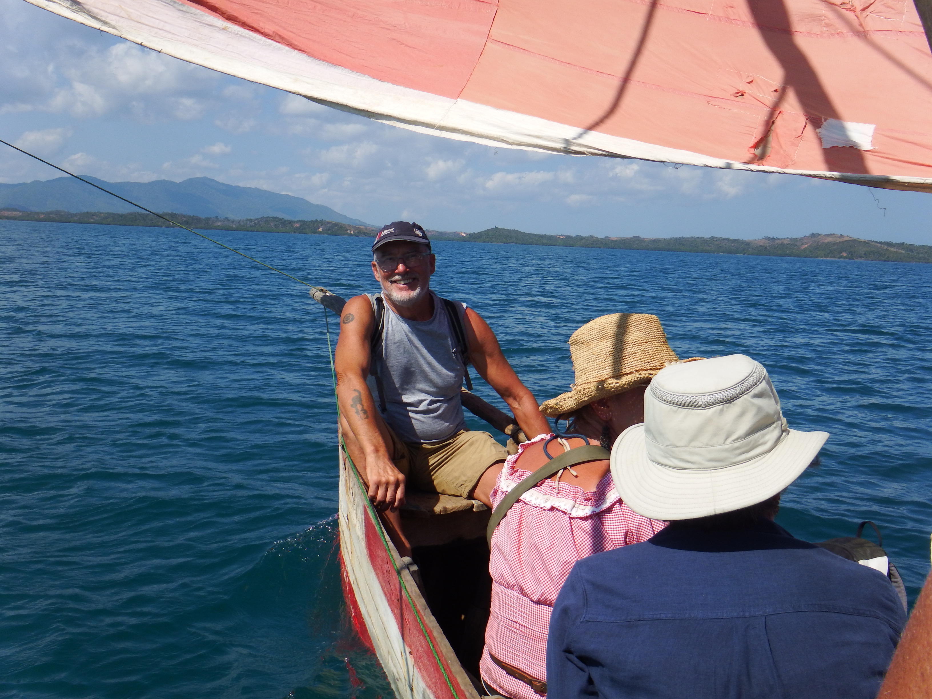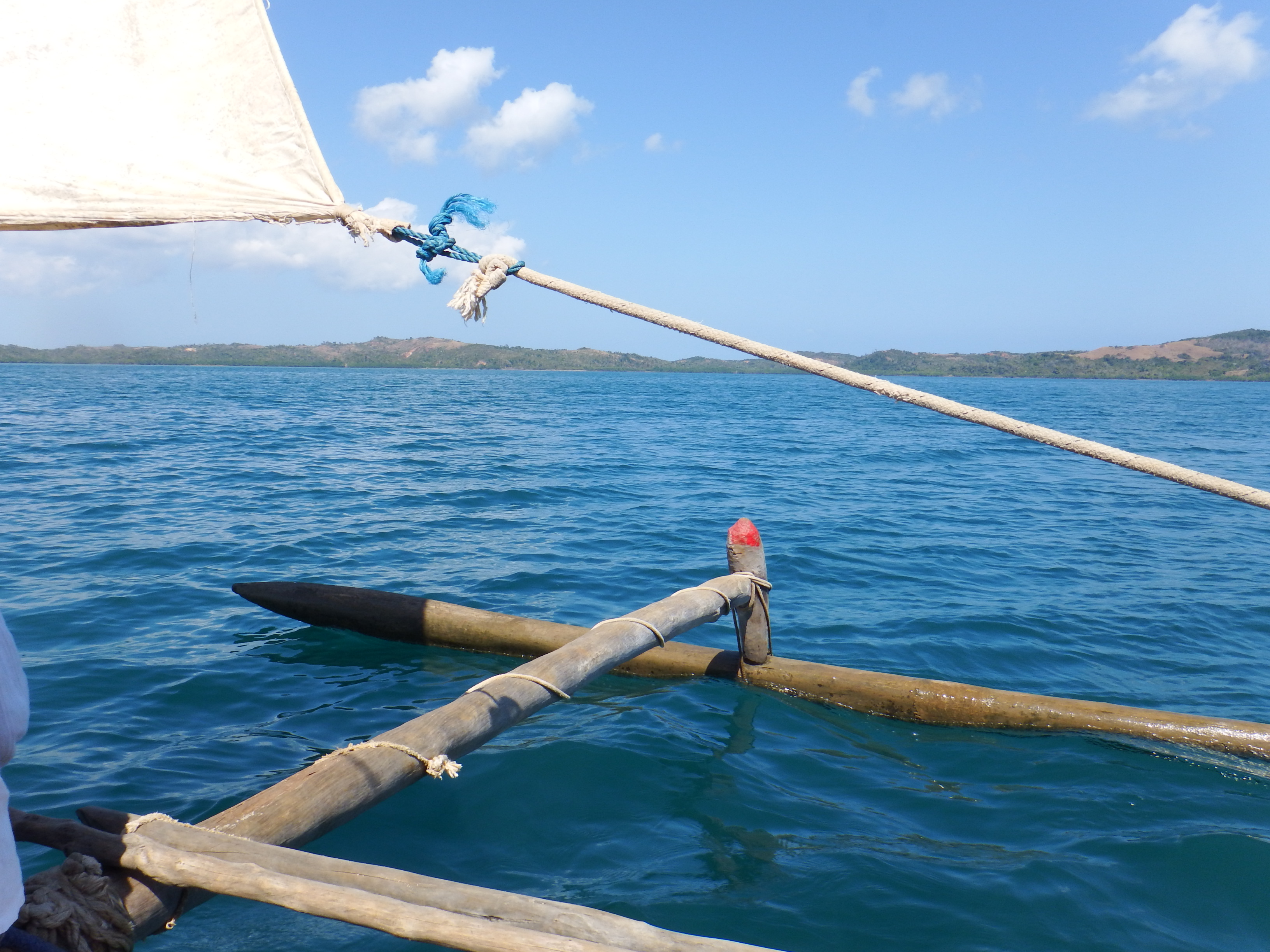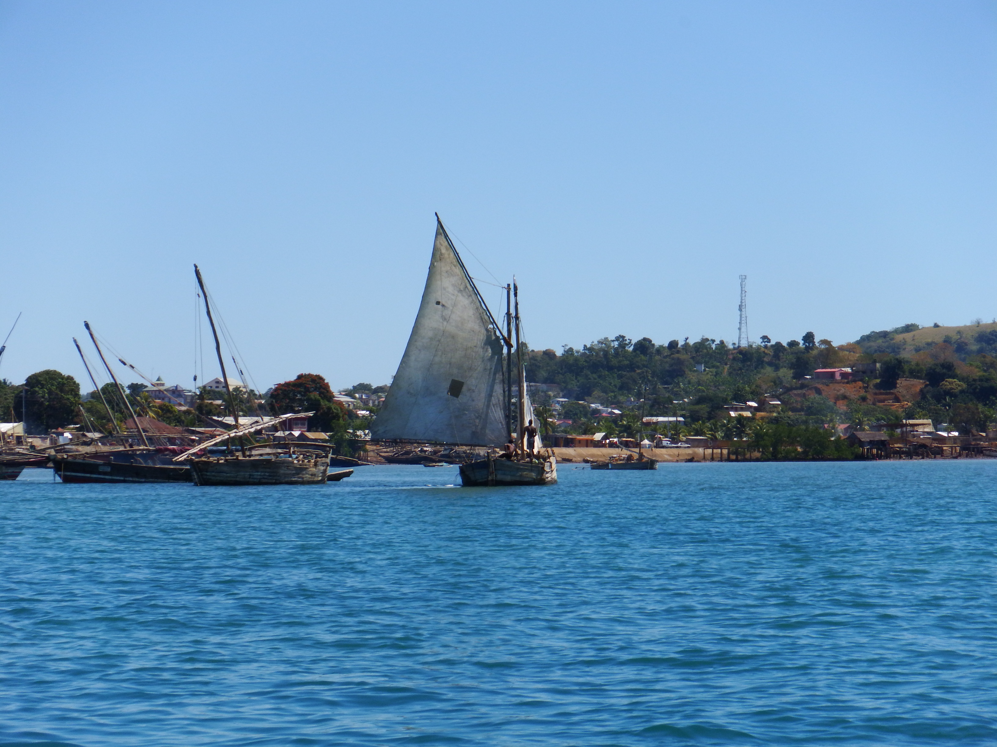 The people in Madagascar are very poor but resourceful. They build their houses from materials gathered from the forest and their boats are totally made of natural materials. With a few exceptions the boats or dhows don’t have any engines and rely on the wind. Fortunately there are good winds here. In the early morning there’s the last of the night breeze blowing offshore and then most mornings a sea breeze strikes up towards the land at about 10am or 11am and goes on as late as 5pm or 6pm so the fishermen go out with one and come back with the other. Their sails are made of anything from rice bags sewn together to traditional heavy cotton sails with lots of varieties in between. Some have been fortunate to be given an old sail from a yacht and I say to those following us ‘don’t throw away any sails or sail material, bring it here’. Our friends on Adina gave away a sail and were given a live chicken in exchange! The Malagasy are very accomplished sailors and we often find they will try and race us when we’re sailing off shore and one of them very nearly beat us!