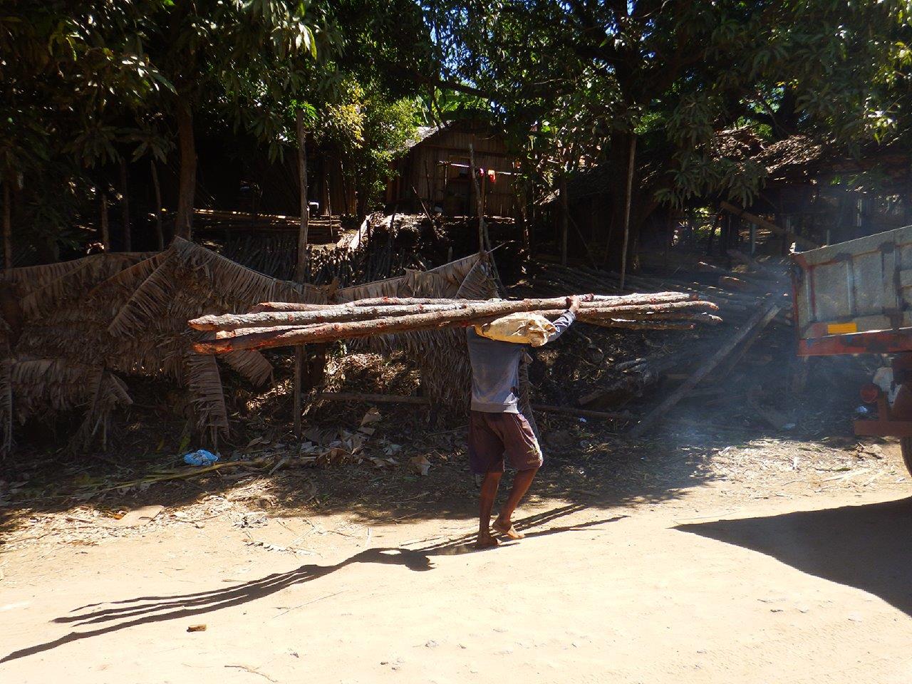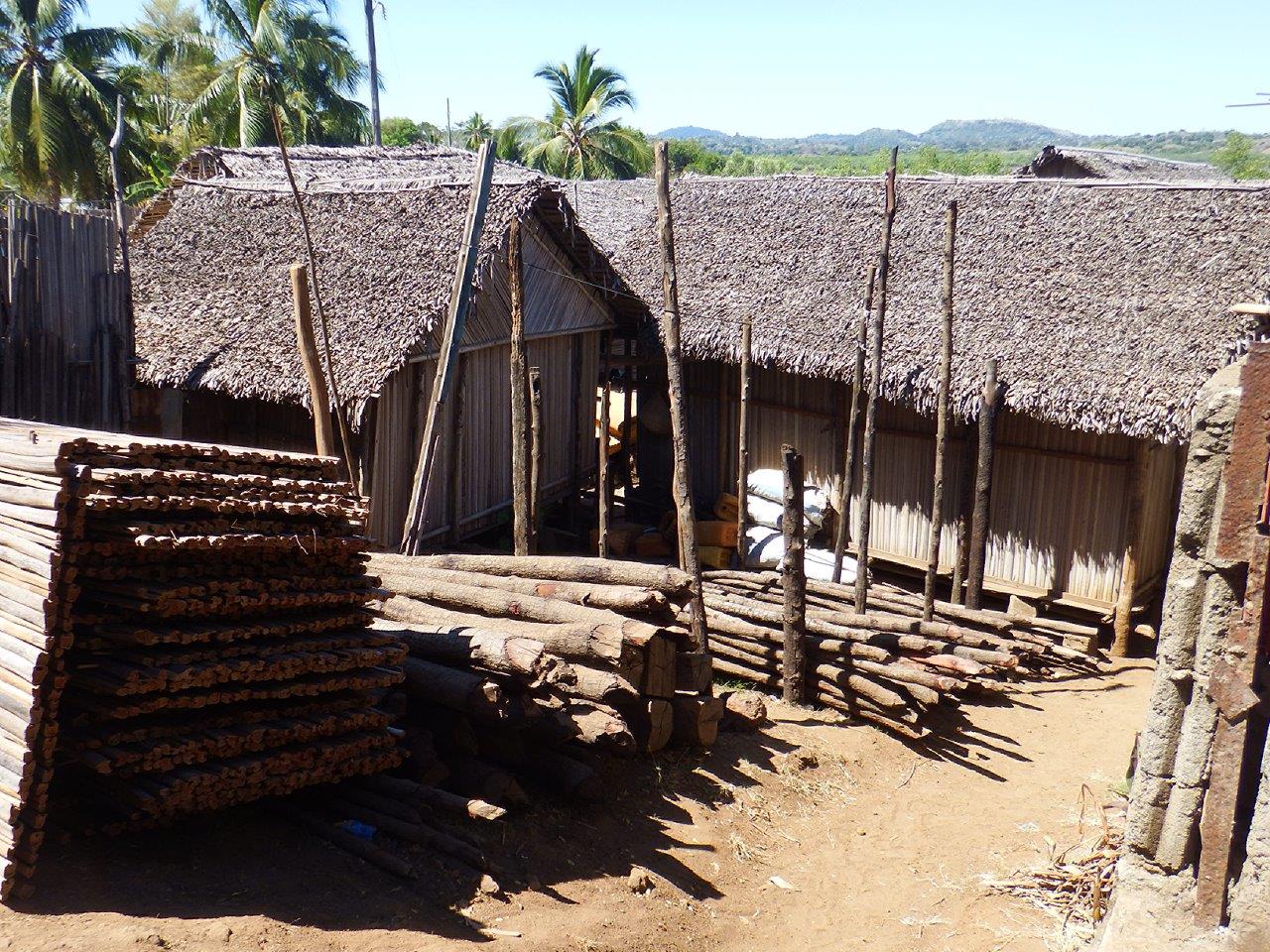 As we walked back down the lane we could see the boats in the anchorage over the top of the buildings. On a closer look of the buildings we realised it was some kind of builders merchant. There were roof sections made of palm leaves, different sized logs for the frame work and sides of buildings made of split bamboo.