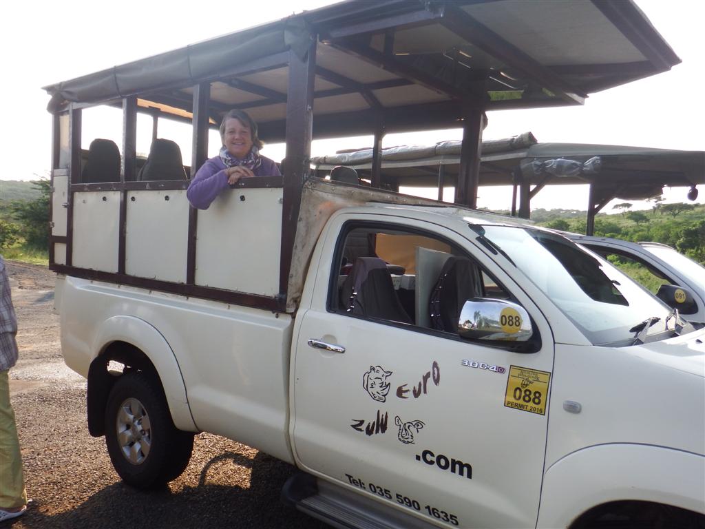 After our rainy boat trip to see the hippos we awoke the next morning to a better day – although at 4am it was still dark! We packed up the car and waited for the safari jeep to arrive. We didn’t want to stay in St Lucia for a second night and had booked a place near the northern gate of Hluhluwe. The plan was to follow the jeep to the eastern gate, leave the car inside, rejoin the jeep for our safari after which we could drive ourselves through the park to the northern gate. Our jeep arrived with Steve our guide. We had booked an elite safari with Euro Zulu safaris. This meant there were only 6 in our jeep and the middle seats weren’t filled. We had our friends Davina and Antony with us and a couple called Andy and Emma also joined us. At 6.15 the sun was out and we were ready to see some animals. I’ve been wanting to do this since I was a little girl.